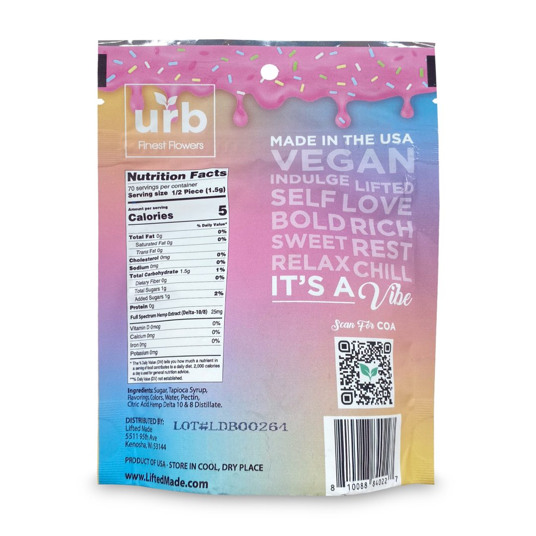 The Urb Delta Gummies Birthday Cake contain 20 mg of Delta-8-THC AND 20 mg of Delta-9-THC per gummy and have a delicious tangy watermelon flavor. Each package contains 30 gummies, for a total of 600 mg Delta-8-THC AND 600 mg Delta-9-THC per bag. These yummy gummies deliver a potent and energizing feel that will get you motivated and keep you going. These edibles are made with flavorless distillates derived from US-grown hemp, so there’s no cannabis flavor!